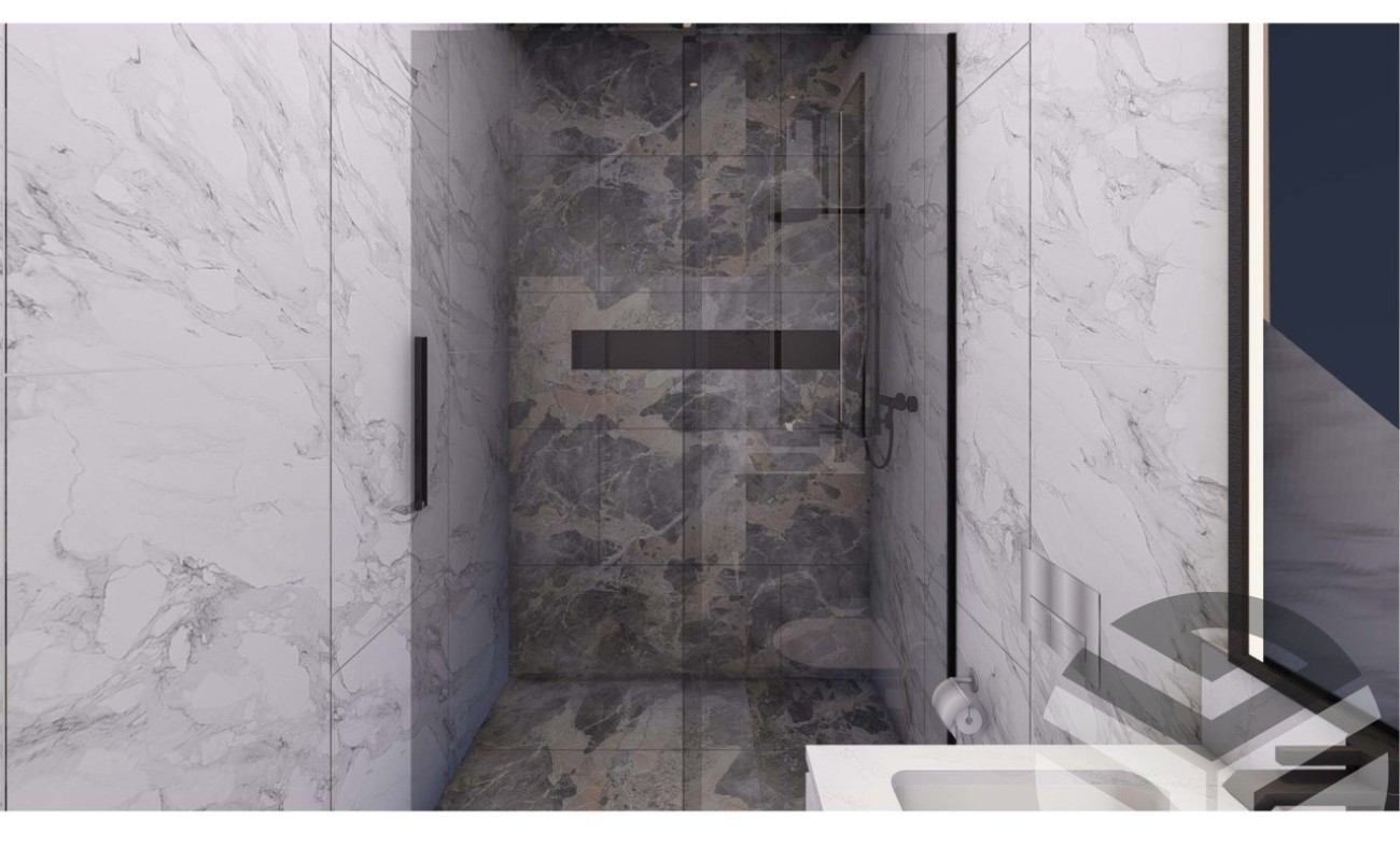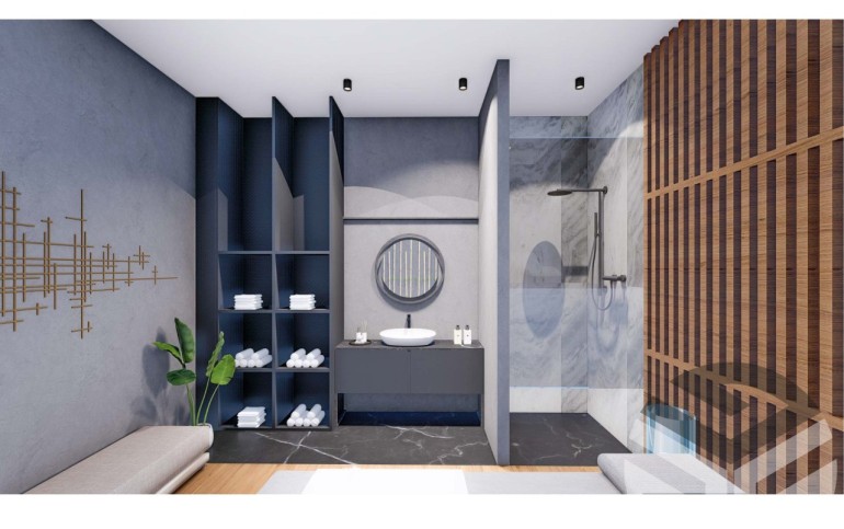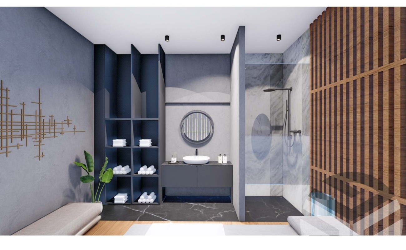 • Встроенная мебель в ванных комнатах, умывальник, подвесной унитаз, душевая кабина